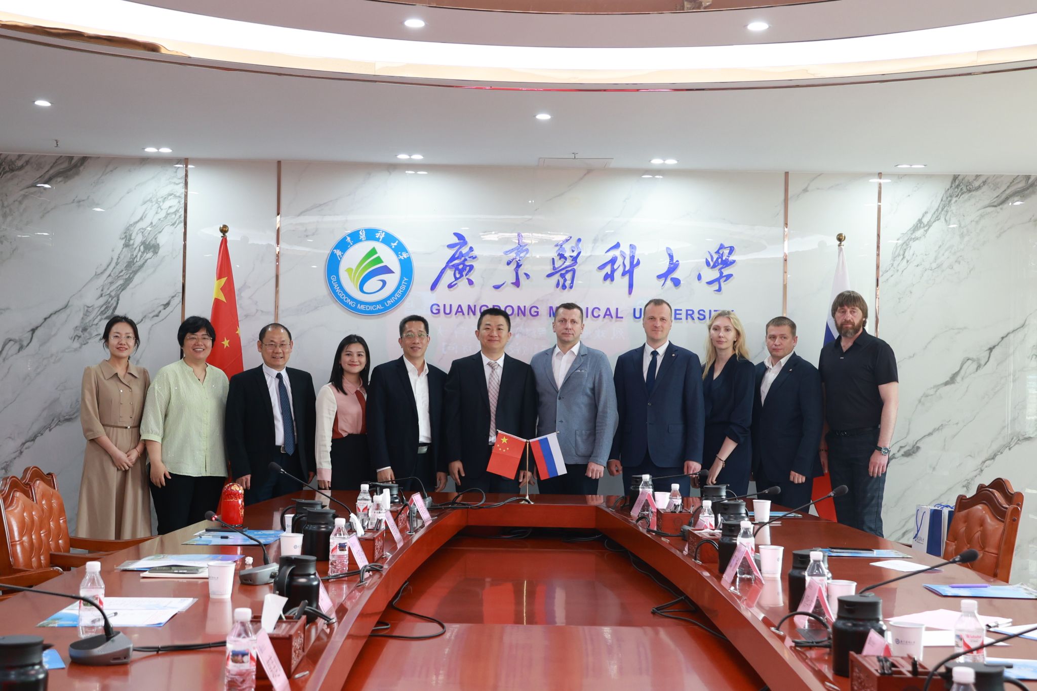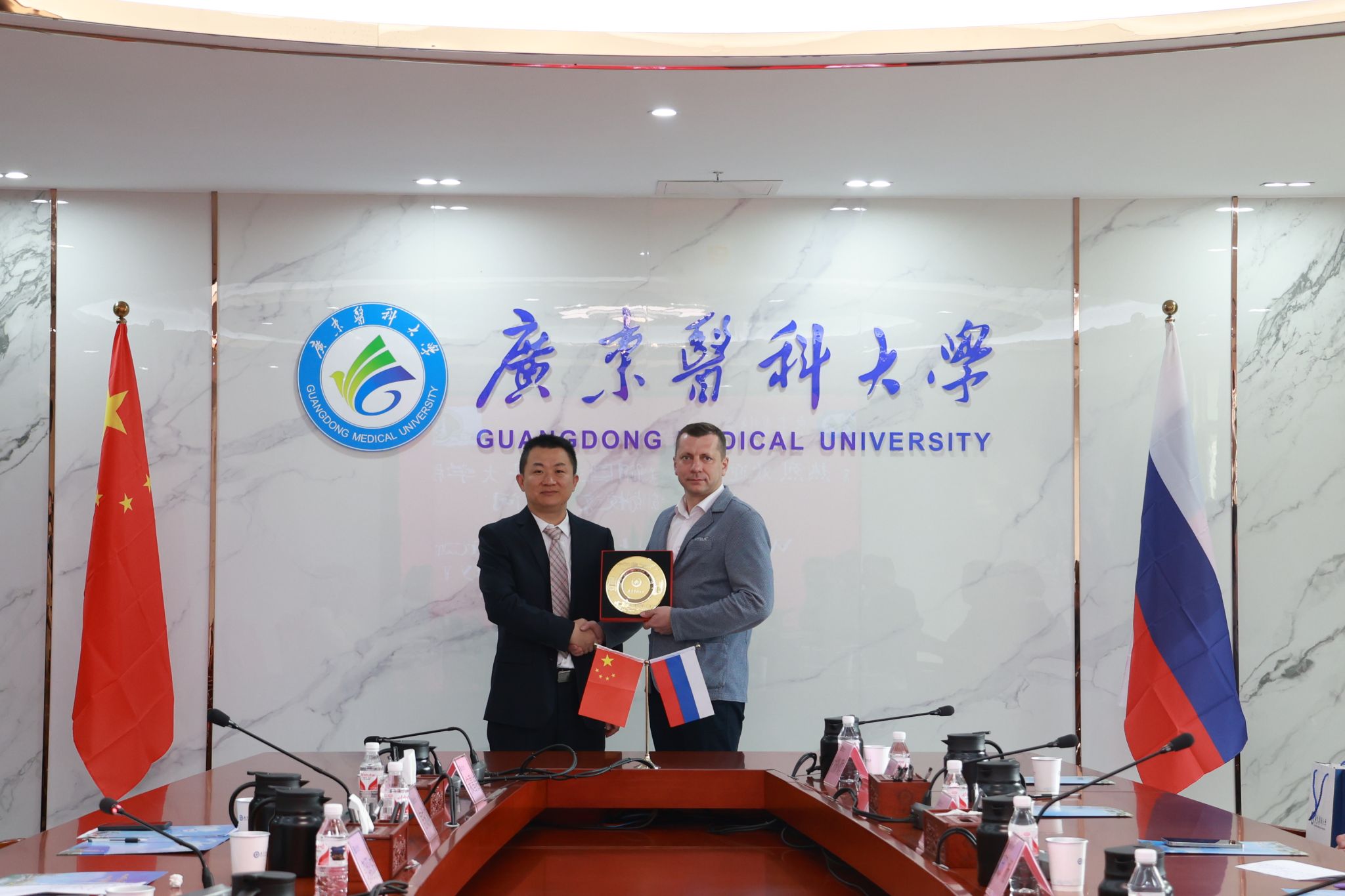 4月29日,俄罗斯秋明国立医科大学校长Петров Иван(彼得罗夫·伊万)、副校长Ефанов Алексей(叶法诺夫·阿列克谢)、国际教育总监Шарабодова Александра(沙拉博多娃·亚历山德拉)、校长助理Юлиана Перова(尤利安娜·佩罗娃)、俄罗斯教育中心执行董事Пономарев Михаил(波诺马列夫·米哈伊尔)等一行10人访问了我校东莞校区。副校长石明、对外交流合作部主任郭绍波、科学技术部副主任(主持工作)郭莲仙、第二临床医学院党委书记、院长官成浓、药学院院长申丽等接待了来宾一行。双方在科技楼一楼会议室开展交流座谈,座谈会由郭绍波主任主持。